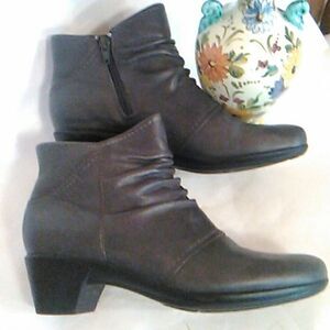 Style: Cammie. Stone Grey. Mooshie calf. Soft lining, padded foot bed. Inside zip. Pretty stitching. Size 7.5 measures 10.5 long, 3.5 wide, 2 high. Excellent condition.