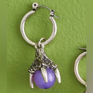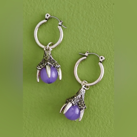These clawesome hinge-style hoop earrings feature faux purple resin stones gripped by detailed dragon claw pendants. These striking earrings are perfect for the Ren Fair or for any everyday mystical fit!