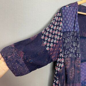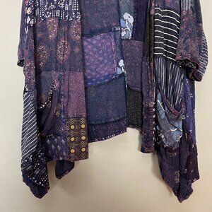 Earthbound women’s lightweight jacket / layering piece with open front and 3/4 length sleeves. Handkerchief/ shark bite hem. Eclectic patchwork design in purple/indigo/blue shades.