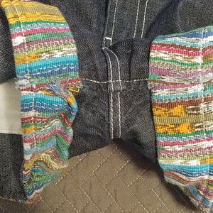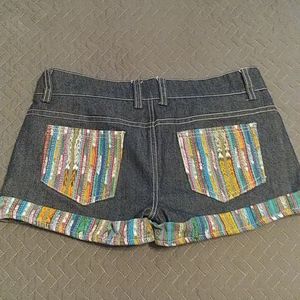 Earthbound Patterned Jean shorts, size M, fits kind of like a 8/10, super cute and fun design trim and pockets with dark denim.