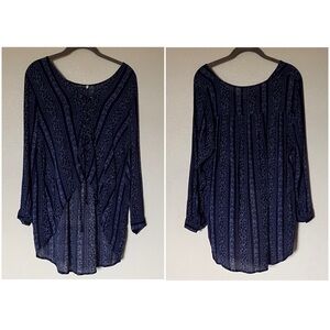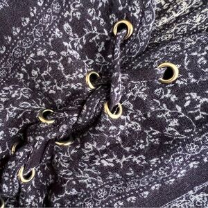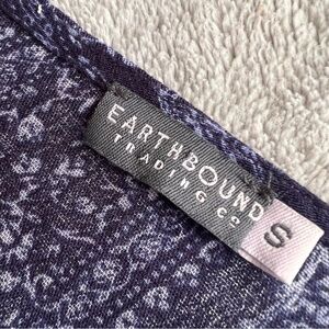 Excellent used condition. Boho Paisley Lace-Up Flowy Blouse by Earthbound Trading Co. in blue with white detailing. Beachy cottagecore aesthetic, a versatile piece that can be dressed up or worn casually. Lightweight blouse with v-neck and lace-up front. Hi-low hem and flowy silhouette. Long sleeves with button cuffs and optional roll-tab detail. Allover stripe cottage ditsy floral print, see video. 100% rayon. Size small, see photos for measurements.
