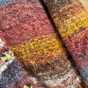Fluffy, soft and chunky Wool, Polyester, Nylon and Acrylic blend material. It features horizontal stripes in a vibrant, earthy color palette, including shades of red, blue, yellow, brown, and cream. A playful fringe trim that adorns the hemline, adding a unique texture and movement to the garment.