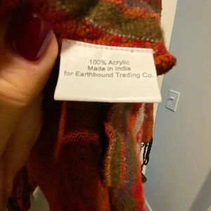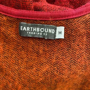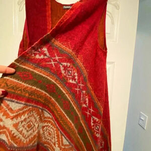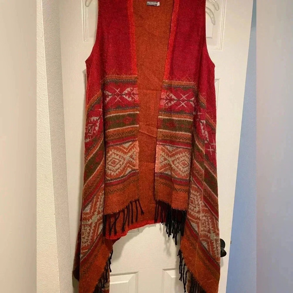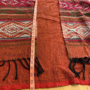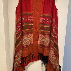 Gently used Earthbound Sweater Wrap or Cape in Aztec print with colors of red orange green and black fringe. No stains or rips. Very good condition.