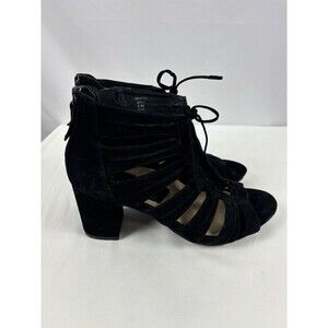 Earthies Saletto Cage Sandals Booties in Black Suede, Women’s Size 8.5 B. These stylish lace-up sandals feature a supportive arch, comfortable low block heel, and a trendy cage design. Easily adjustable with front ties and a convenient back zipper for easy on and off. Crafted from premium suede, perfect for both casual and dressy occasions.