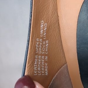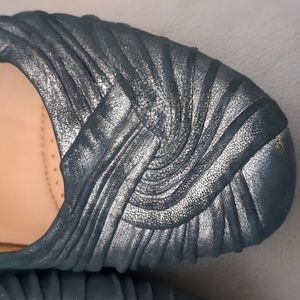 Look at the detail on these shoes! The pewter color is beautiful with a green/blue undertone. There is a small wedge to this shoe about 1 inch. Leather upper and leather sock lining. The cushioned sole will help you stay comfortable all day.