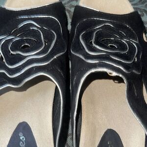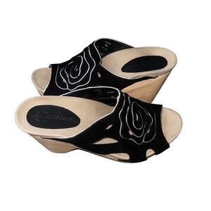 Earthies Womens Tropez Open Toe Suede Flower Chunky Wood Heel Sandals Black Sz 7