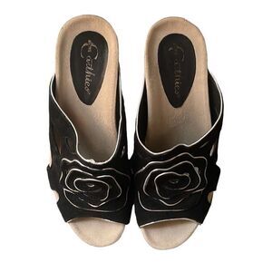 Earthies Womens Tropez Open Toe Suede Flower Chunky Wood Heel Mule Sandals Black Size 7