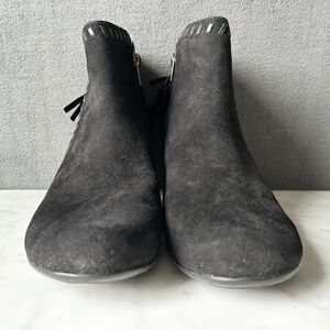 Earthies Zurich women's size 9 western style booties. Black suede leather upper with fringe at the ankle. Side zip. Leather/man-made lining. Leather-covered high density foam footbed. Wrapped, sculpted heel and rubber outsole. Excellent condition with small nick on back of left heel.