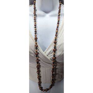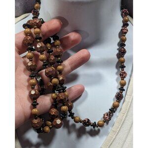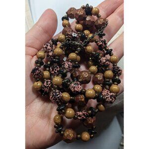This earthy beaded necklace features speckled beads in black, pink, brown, and gold tones. Perfect for adding a touch of elegance to any outfit. Handmade with care.