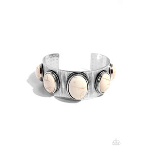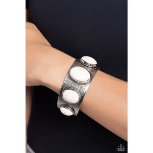 Set in elevated silver fittings, various oval white stones wrap around the wrist atop a highly textured silver cuff for an earthy echo. As the stone elements in this piece are natural, some color variation is normal.