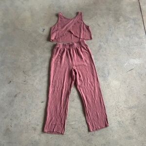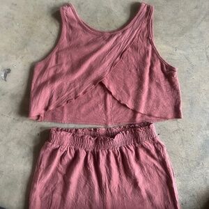 Earthy brown / rusty orange matching set, 100% cotton. Pants are high waisted, straight leg, stretchy waistband. Top is sleeveless and open in the back (the part visible in the picture). Very comfortable for hot weather. Worn a few times, excellent condition. No rips, stains, tears, or holes. Brand is HYFVE.