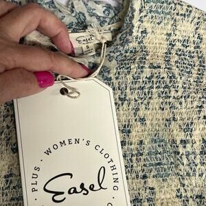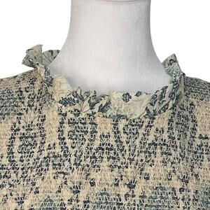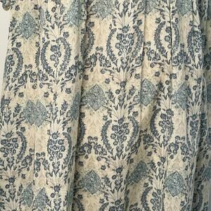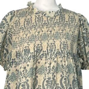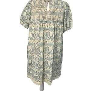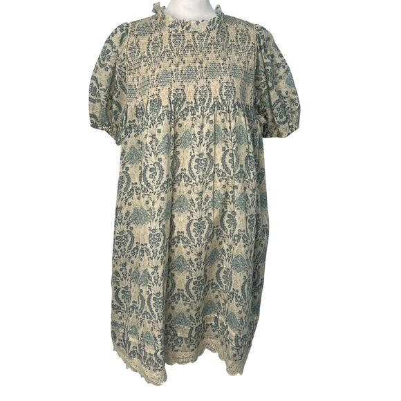 Easel Babydoll Smocked Antique Blue Cream Floral Damask Lace Trim Dress S Boho Prairie Flowy Puff Short Sleeves Pocket Lined Paisley Soft Coquette NWT