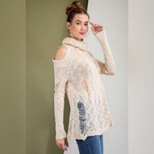 Easel | Bethany Distressed Destructed Cold Shoulder Sweater Tunic Cream Medium