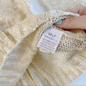 Cowl neck distressed cold shoulder knitted sweater tunic. Features ribbed neck, shoulders and cuffs, and bottom hem. Exposed shoulders. Heavy distressing throughout - this is easiest to see on the model photos.