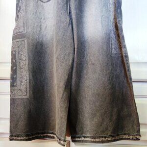 -Black Stonewashed Denim with white paisley bandana print, vintage look with oversized loose fit, wide legs, adjustable faux wood buttons, distressed with frayed holes, frayed bottom cuff openings, large front chest pocket with small coin pocket, 2 back pockets, very slouched and relaxed. Approximate measurements are taken lying flat unstretched: Pit to Pit 23.5", Waist 24", Hip 26", Inseam 23", Length Neck to Bottom (shortest button) 54". 95% Cotton, 5% Viscose. Machine Wash Cold, Line Dry, Lowest Setting Iron.