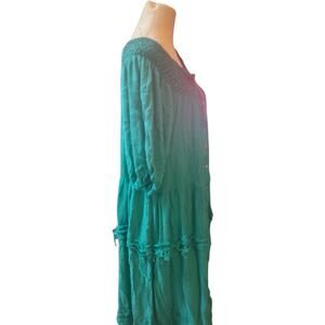 Easel Boho Peasant Button Front Dress, Size Small. Embrace bohemian charm in this gorgeous green dress by Easel. Crafted from 100% rayon, this lightweight piece features a textured smocked neckline, relaxed 3/4 sleeves with gathered cuffs, and a full button-down front. The tiered design with raw edge lace detailing adds soft movement and a touch of rustic elegance. Perfect as a casual dress or worn open as a lightweight duster. Excellent condition. #Boho #Cottagecore #Rayon #Peasant #Bohemian