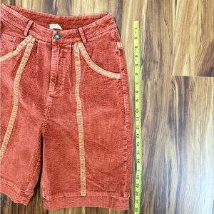 Chic corduroy shorts in a rusty orange color with contrast cream stitching.