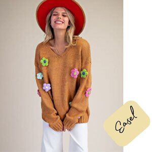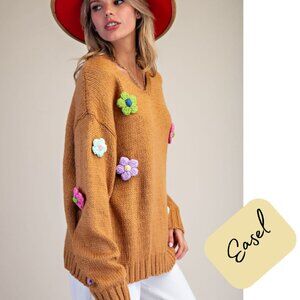 Easel sweater, floral appliqué pullover, crochet flower sweater, boho knit top, cozy fall sweater, oversized knit, V-neck pullover, colorful flower sweater, women’s fashion