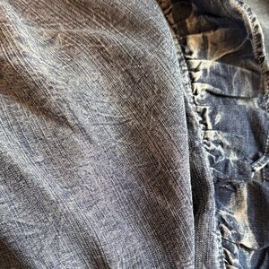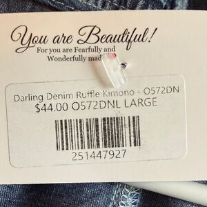 Stylish denim kimono jacket with ruffle details. Open front design. Perfect for layering. NWT