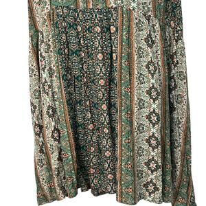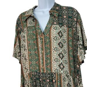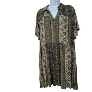 Easel Floral Earthy Geometric Babydoll Dress Sage Green Retro Flair Indie Sz 1X Boho Relaxed Flowy Festival Knee Length NWT
