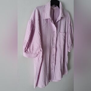 Chic light lavender button down with subtle stripes. Features short puffy sleeves and a classic collar. Ideal for casual or dressy looks
