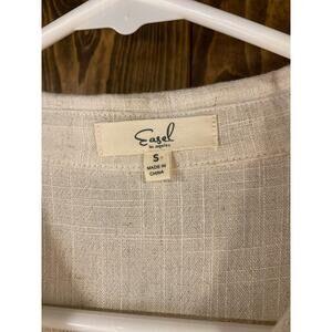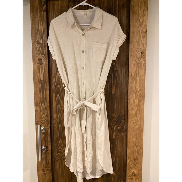 Stunning! Just the most classy and timeless dress ever! Linen!!! Sleeveless, pockets, collared, beautiful buttons! Can tie with belt, or go belt-less for a shirtdress style! Size is a little oversized.