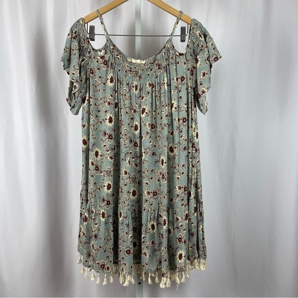 Easel Medium Boho Sunflower Floral Cold Shoulder Tassel Pleat Flowy Dress Loose