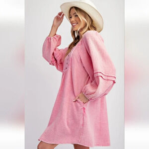 Easel Mineral Washed Cotton Gauze Babydoll Dress Long Sleeve Pink New