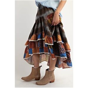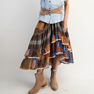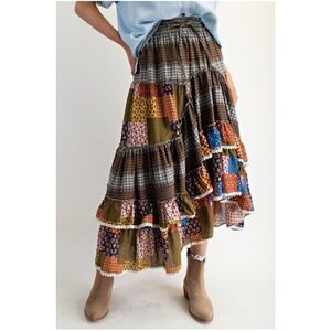 Easel Multicolor Floral Plaid Print Stretchy Waist Ruffle hem maxi Skirt