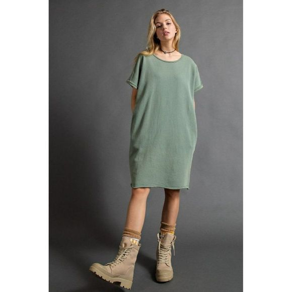 Easel Oversized Mineral Washed Terry Boxy Dress in Juniper Green New