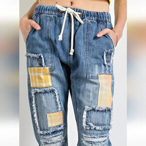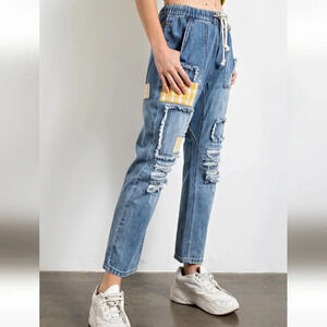New! Easel Patchwork Distressed Washed Denim Pants from Luxury Boutique label Easel which is carried by fine retailers like Anthropologie and Nordstrom