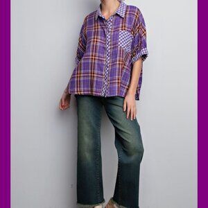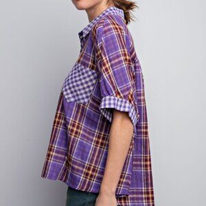 Easel top, purple plaid shirt, oversized button up, gingham pocket, boyfriend shirt, boxy blouse, casual weekend, boho street style, festival layer, collared half sleeve, grunge plaid, chic shacket vibe, work to weekend, lightweight woven.