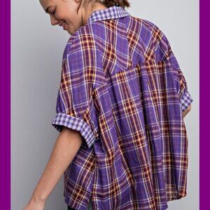 Easel Purple Plaid Oversized Button Down Top NWT M