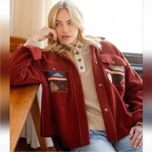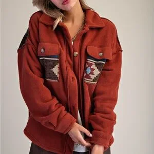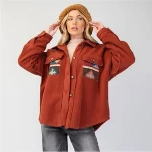 Rust button down with geometric chest pockets. Cozy and stylish design.