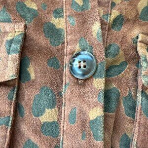 This a brown camo-patterned Easel shacket in size small. It has brown button down the front and on the sleeves.