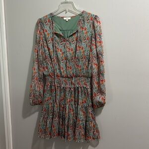 Round neck chiffon baby doll dress with layered ruffles and long sleeves. Smocked sheer waistband, keyhole and tie neckline. Flow-y. Sheer sleeves with elastic cuff. Dress lined in Kelly green.