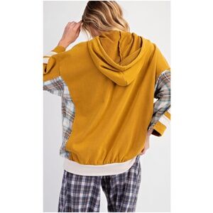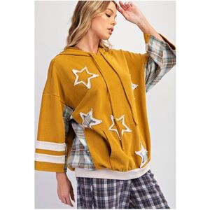 Easel Star Patch Plaid Cotton 3/4 Sleeve Hoodie Shirtshirt Top