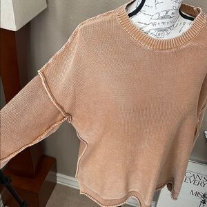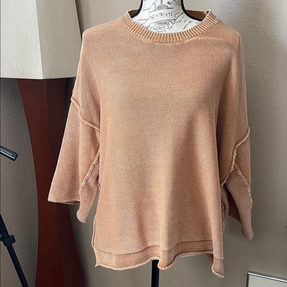 Sz medium. Cute oversized sweater with three-quarter length sleeves. Really soft. 25 inches across the chest and 26 inches in length. Oversized boxy fit. 100% cotton.