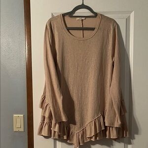 Chic tan blouse with elegant ruffle details. Long sleeves and soft fabric.