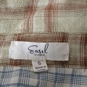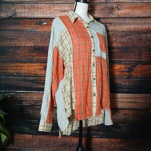 Easel Top S Patchwork Distressed Button Front Asymmetrical Fringe Plaid Shirt