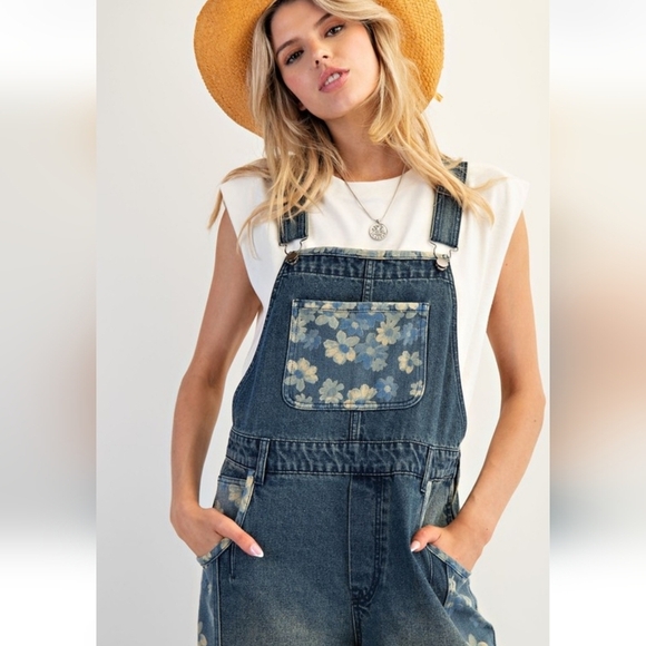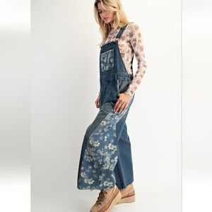 New with Tag Easel Blue Jean Washed Denim Floral Overalls Jumpsuit from Luxury boutique label Easel which is carried by fine retailers like Anthropologie and Nordstrom