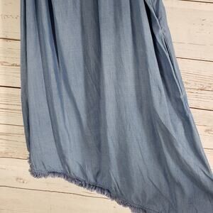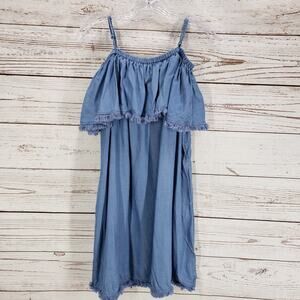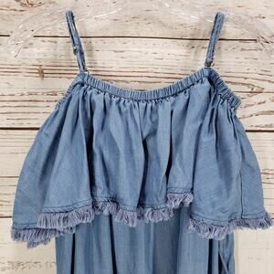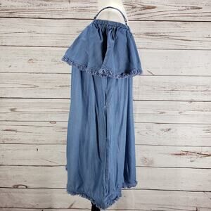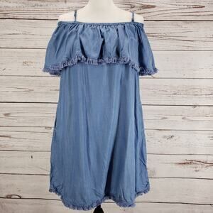 Easel Women's Blue Chambray Off Shoulder Fringe Side Pockets Dress Size Small