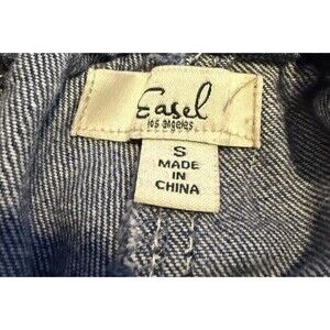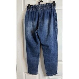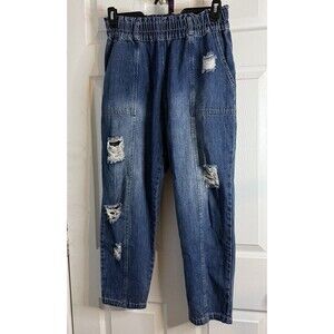 The Easel Women's Distressed White Burch Pull On Jeans in size small feature a relaxed fit and elastic stretch waist for added comfort and flexibility. Made of denim fabric with a medium wash, these jeans have a unique distressed look and tapered style. The jeans also include pockets for added functionality. Perfect for women looking for a stylish and comfortable denim option.