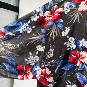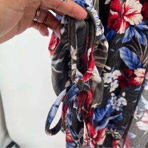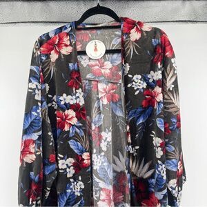 Oversized; can for up to a large-extra large! Open front. Olive green velvet exterior with red, blue, white and creme floral print. Ties at cuffs. Quarter length balloon sleeves. Medium weight. Super cute! 100% Polyester. Pit to pit: 28” and Length: 31”