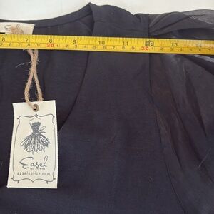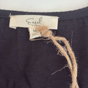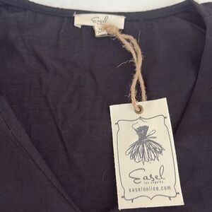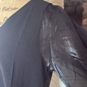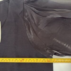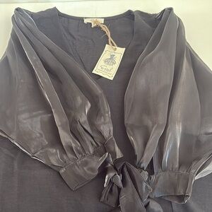 NWT Easel black v-neck mixed media sheer and shiny 3/4 sleeve blouse shirt. Ties at sleeve. Puff shoulder. Slightly rounded hem.