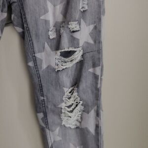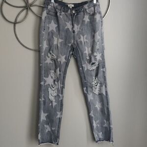 These boutique Easel jeans are awesome!! Gray color, distressing, super comfy, great condition. Size M. Waist laying flat 17". inseam 29" rise 9".