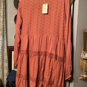 New with tags Easel size large dress. Done in a light rust color, this dress is tired with eyelet and plain fabric made of100% Rayon. It is lined but the back eyelet at the top is see through, full length, long gathered sleeves and knee length. Nice and flowy.