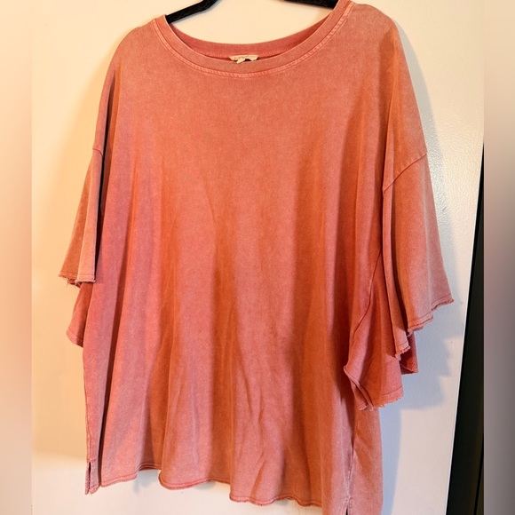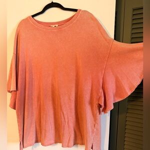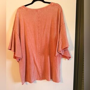 Thicker material like a French terry. Adorable sleeves and such a pretty washed coral color. Size large