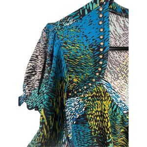 East 5th Abstract Patterned Short Sleeve Stretchy Professional Blouse With Studded Details On Sleeves
