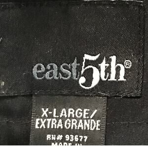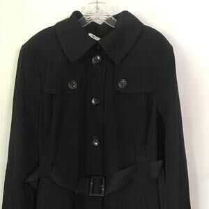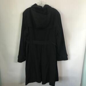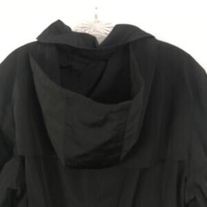 Very nice East 5th women's black trench rain coat. Button front with fabric self tie. Long sleeves. Removable hood. Side pockets in front that button up. Tortoise style belt buckle. Medium weight. Snazzy dressy look for those cool and rainy days. Size Extra Large. XL.